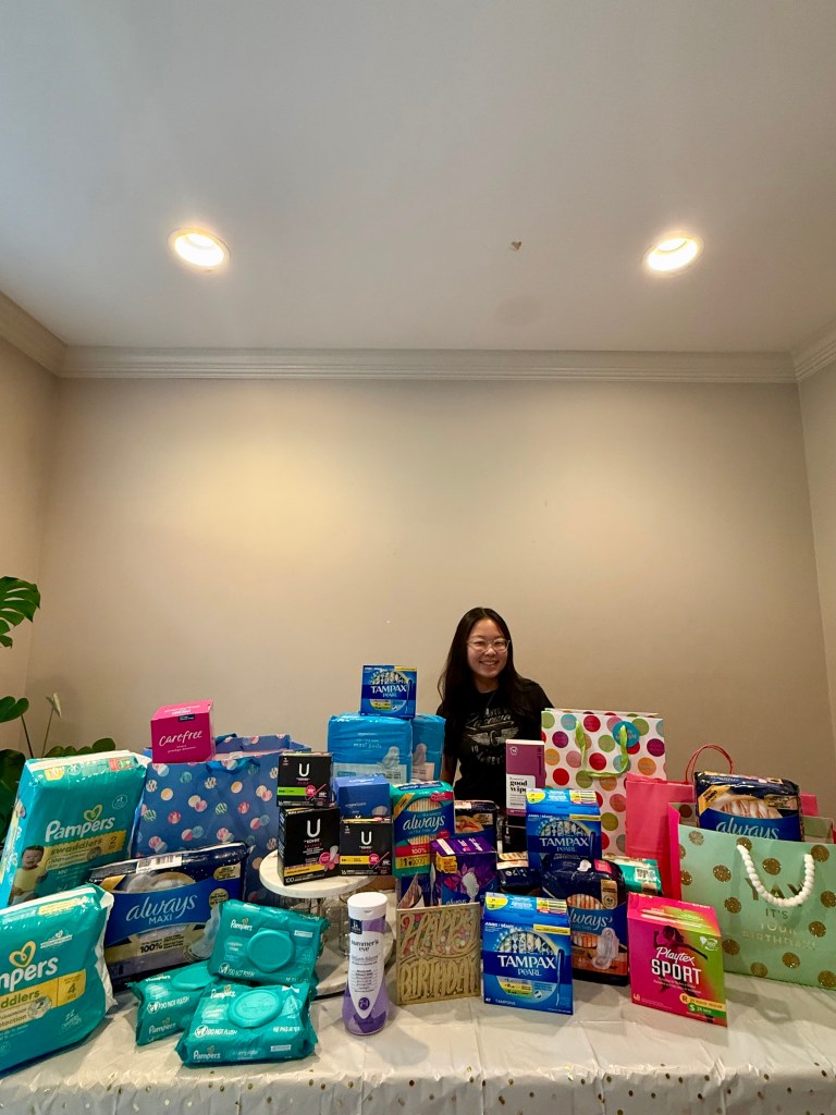 Our founder recently turned 17 and asked guests and peers to bring in period and baby products instead of gifts! The response was incredible; thanks to everyone’s support, we collected over 60 boxes and more than 1,000 units of hygiene items to donate.